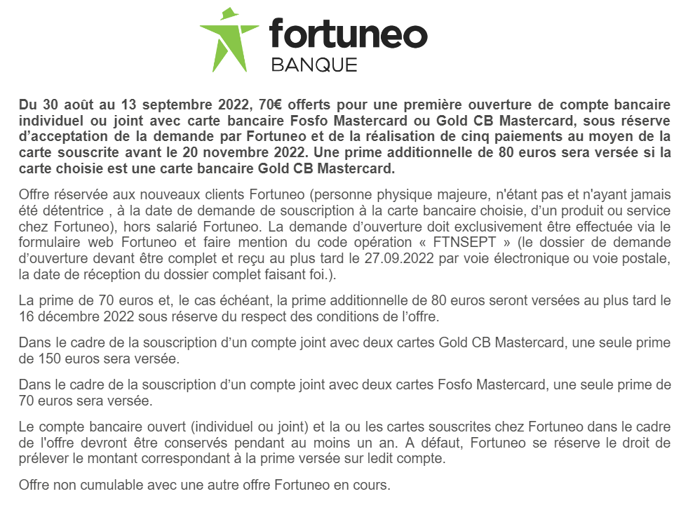 Vous êtes tentés par l'aventure ? Dès aujourd'hui, et jusqu'au 13 septembre, Fortuneo vous offre une prime de bienvenue exceptionnelle, d'un montant de 150 euros, pour l'ouverture d'un compte bancaire avec une carte bancaire Gold CB Mastercard, et sous réserve d'effectuer 5 paiement au moyen de la carte souscrite avant le 20 novembre 2022 (4). C'est vraiment le moment d'en profiter.