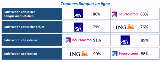 + 8 points, c'est également la progression d'ING, qui reste une valeur sûre. La banque en ligne d'origine néerlandaise remporte cette année deux trophées, (contre trois l'an passé) et voit la qualité de son application mobile particulièrement saluée. Sur le conseiller projet, elle est en revanche dépassée par Axa Banque. L'assurbanquier fait une belle percée, avec 3 trophées récompensant ses conseillers banque au quotidien et projet, ainsi que son site web. Elle prend la place de Hello Bank : la banque mobile de BNP Paribas perd, en moyenne, 5 points de satisfaction et ne remporte aucun trophée cette année.