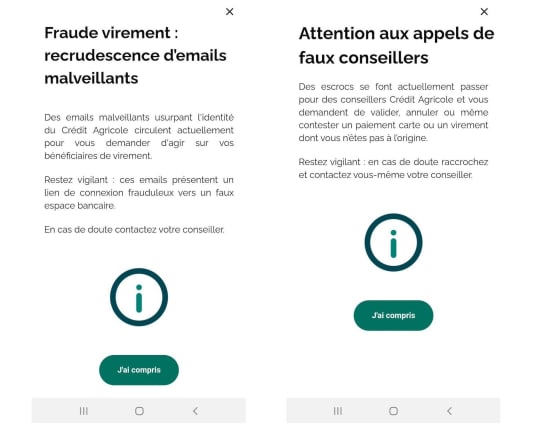 Aux grands maux les grands remèdes : au Crédit Agricole, mais également chez BoursoBank et d'autres, la prévention est passée à l'étape supérieure. Les messages s'affichent désormais au moment de la connexion à l'application mobile ou lors de la réalisation d'une opération sensible. Mieux, ces messages contraignent l'usager à être actif : ils restent affichés tant qu'il n'a pas cliqué sur un bouton pour signifier qu'il en a bien pris connaissance. Intrusif, mais efficace, à l'image de certaines publicités dites « interstitielles » s'affichant sur les sites web.
